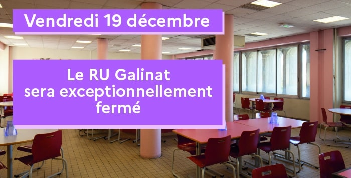 En raison de travaux sur le réseau électrique, le restaurant universitaire sera exceptionnellement fermé ce vendredi 19 décembre toute la journée. Pour vos pauses repas, deux cafétérias restent ouvertes sur le campus Timone. Nous nous excusons pour la gêne occasionnée et vous remercions pour votre compréhension.
