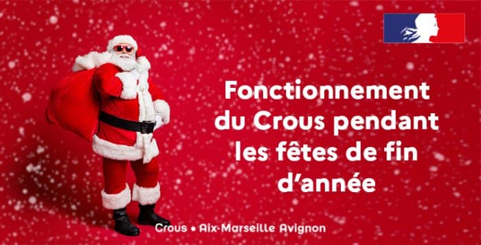 Les services administratifs du Crous Aix-Marseille Avignon (Aix-en-Provence, Marseille et Avignon) seront fermés à partir du 19 décembre 2025 au soir au 4 janvier 2026 inclus.